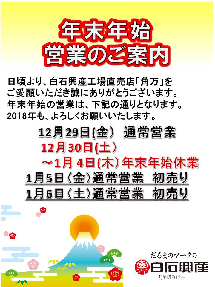 年末年始お休みのお知らせ【2017/12/29】