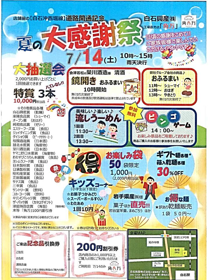2018年7月14日(土)白石興産工場直売店「角万」は、〝夏のお客様大感謝祭〟を開催いたします。今回は、店舗前の道路「白石沖西堀線」の開通記念もかねての開催です。