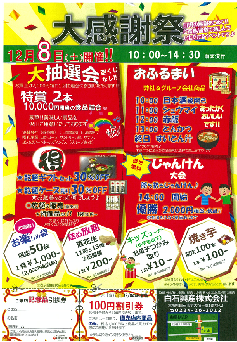 2018年12月8日(土)、白石興産」は〝冬のお客様大感謝祭〟を開催いたします。開催時間は10時〜14時30分です。